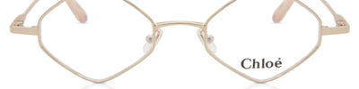 The Chloé CE2158 eyeglasses, color code 780, showcase a geometric frame design in rose gold metal. These full-rim glasses feature a lens width of 46 mm, a 20 mm bridge, and 150 mm arm length. Equipped with demo lenses, this model is tailored for women and is identified by UPC/EAN 886895417341.
