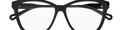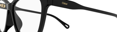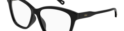 The CHLOÉ CH0084O 001 eyeglasses feature a black plastic frame with transparent demo lenses, shaped in a rectangular-square design. They have a 15 mm bridge, 140 mm temple length, and 51 mm lens width. These frames are designed for women, are non-polarized, lack photochromic properties, and are compatible with prescription lenses.