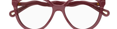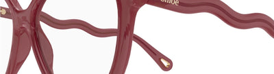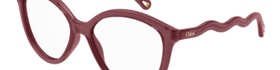 The CHLOÉ CH0089O 004 eyeglasses feature a burgundy plastic frame with a cat-eye shape, designed specifically for women. They include clear demo lenses with a 54 mm width, a 16 mm bridge, and 145 mm temple length. These prescription-ready glasses are non-polarized and carry the color code 004, combining elegant design with practical measurements.