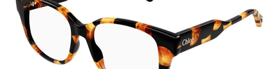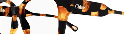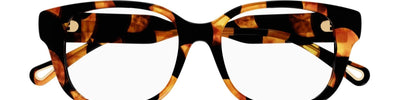 These eyeglasses feature a rectangular-square shape with a Havana-colored plastic frame and transparent lenses. Designed for women, they have a 16mm bridge, 140mm temple length, 55.3mm lens width, and 42.5mm lens height. The lenses are demo type, non-polarized, non-photochromic, and gradeable, offering a precise fit and professional style.