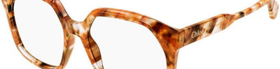 The CHLOÉ CH0263O 005 model by Chloé showcases a square, full-rim frame made from plastic in a Havana and transparent finish. Weighing 37 grams, it lacks spring hinges but is compatible with progressive lenses. This eyewear is produced ensuring quality and precision.
