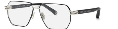 These men's full-rim glasses by Philipp Plein, model VPP114M, feature an irregular shape with a matte black metal frame. They have a 13 mm bridge, 140 mm temples, and a base curve of 4. Designed to accommodate prescription lenses, this sophisticated design combines durability with a modern aesthetic.