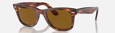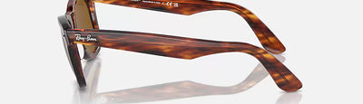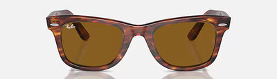 The RAY-BAN RB2140 954 features a square-shaped frame crafted from polished striped Havana acetate. The temples match the striped Havana pattern for a cohesive design. It includes solid B-15 brown lenses designed for clarity and protection. Dimensions are 50mm lens width, 22mm bridge width, 41mm lens height, and 150mm temple length, offering a balanced fit and classic style.